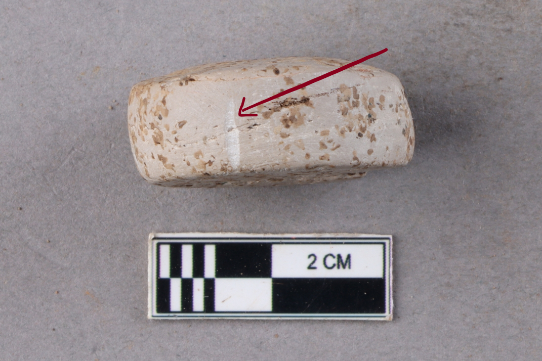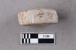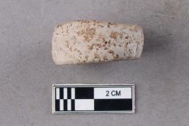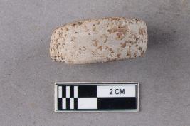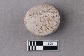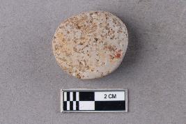 A small, slightly irregular disc-like object with rolled edges. It is white in colour.