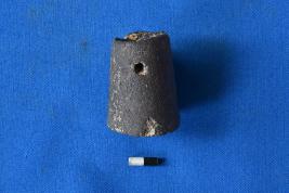 | Description / विवरण | A pendant of terracotta in cylindrical shape with tapering sides, a depression at the top, a flat base, a transverse perforation and a smooth black coloured surface. |