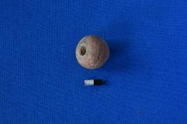 | Description / विवरण | An arecanut shaped bead of terracotta with striation marks on the surface and perforation at the center. |