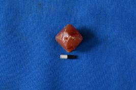 | Description / विवरण | A square shaped biconical truncated bead of carnelian with a semi-finished surface and perforation in a slant position. |
