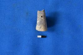 | Description / विवरण | A cylindrical shaped pendant of terracotta with tapering sides and flat circular base and has a depression at the top. |