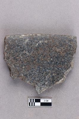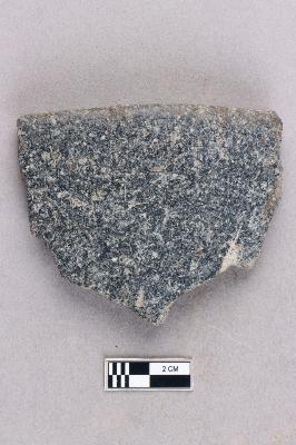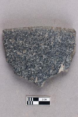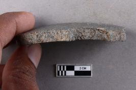 | Description / विवरण | A featureless rim fragment of a stone bowl. The stone is grey and speckled in appearance. |