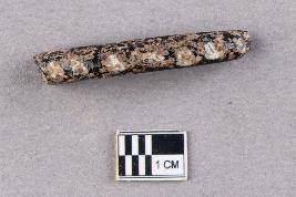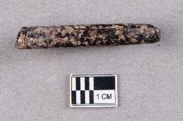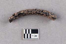 | Description / विवरण | An opaque, smooth glass bangle fragment. The fragment is black in colour with a strip of white dots on the outer surface as decoration. |