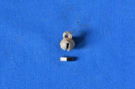 | Description / विवरण | Trinklet of torso shape, the upper part shows a hole and the lower a cut with a patinated surface. |