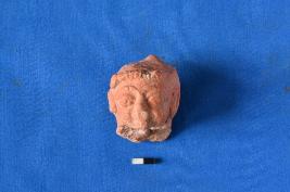 | Description / विवरण | A double moulded head of terracotta with big eyes, nose, lips and a closely fitted headgear. |