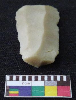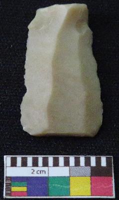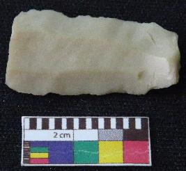 | Description / विवरण | Blade is whitish in color, made of fine grained chert stone, having positive bulb of percussion, smooth body, retouched sides and mid ridge. |