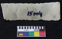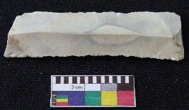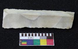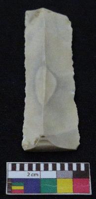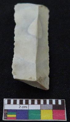 | Description / विवरण | Fragment of blade is off white in color, made of fine-grained chert stone, having smooth body, retouching on either side mid ridge and triangular section. |