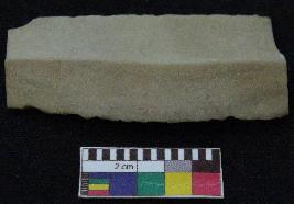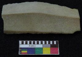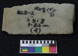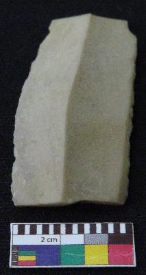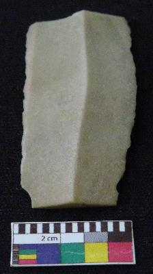 | Description / विवरण | Fragment of blade is off white in color, made of fine-grained chert stone, having smooth body, retouching on either side mid ridge and triangular section. |