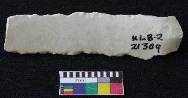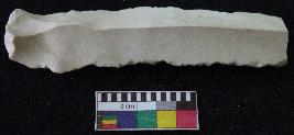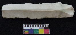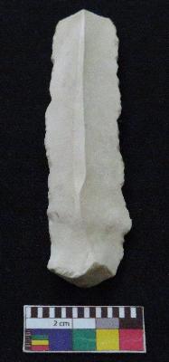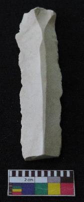 | Description / विवरण | Fragment of blade is whitish in color, made of fine grained chert stone, having positive bulb of percussion, slightly rough surface, retouched sides, mid ridge and triangular section. |