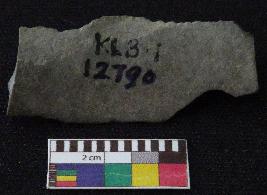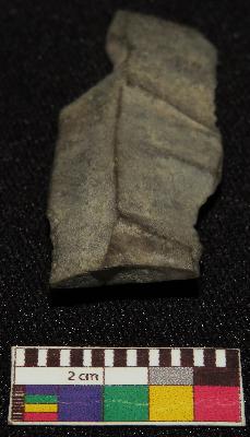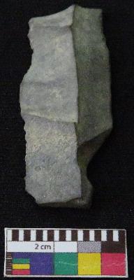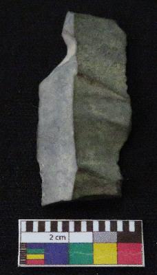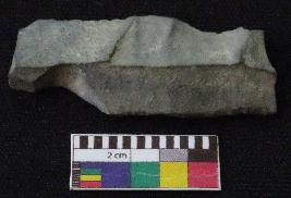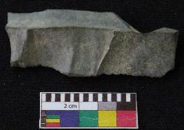 | Description / विवरण | Fragment of blade is blackish in color, made of fine-grained stone, having smooth body, retouching on one side, other is partly broken, mid ridges and triangular section. |