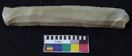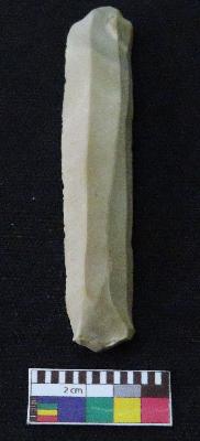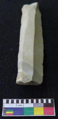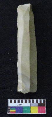 | Description / विवरण | Blade is whitish in color, made of fine-grained chert stone, having positive bulb of percussion, smooth surface, parallel retouched sides and mid ridge. |