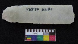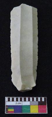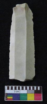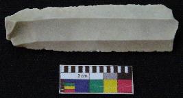 | Description / विवरण | Fragment of blade is whitish in color, made of fine-grained chert stone, having positive bulb of percussion, smooth surface, parallel retouched sides and two ridges. |