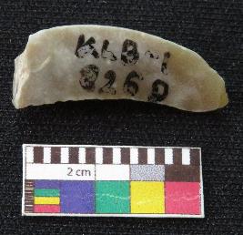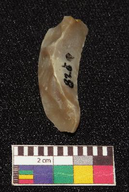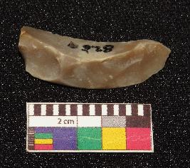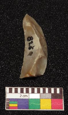 | Description / विवरण | Fragment of stone blade is in brownish color, made of fine-grained chert stone, having broken one end other is pointed, no retouching on either sides, smooth surface, curved body, mid ridge and triangular section. |