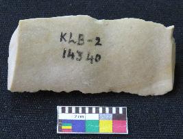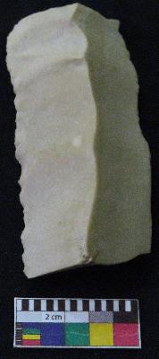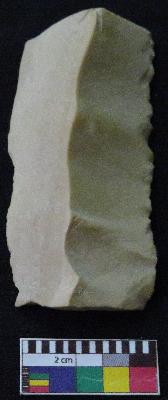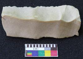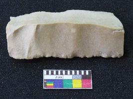 | Description / विवरण | Fragment of stone blade is in white color, made of fine-grained chert stone, having broken ends, one side is completely retouched while other is partly retouched, smooth surface, mid ridge and triangular section. |