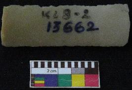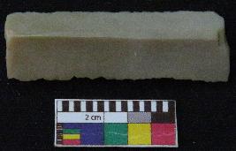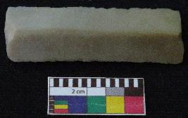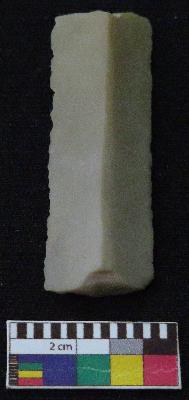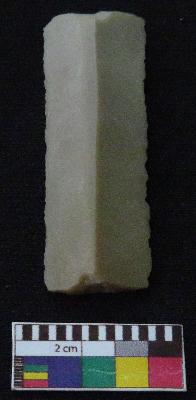 | Description / विवरण | Fragment of stone blade is in off white color, made of fine-grained chert stone, having broken ends, retouched parallel sides, smooth surface, mid ridge and triangular section. |