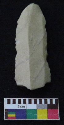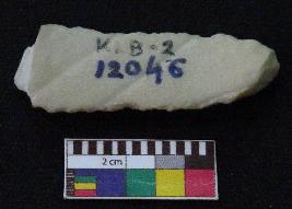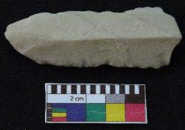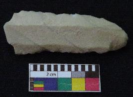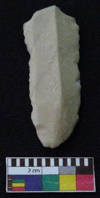 | Description / विवरण | Fragment of stone blade is in off white color, made of fine-grained chert stone, having one end broken, other end is curved, retouched parallel sides, smooth surface, mid ridge and triangular section. |