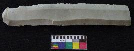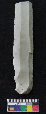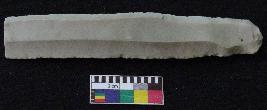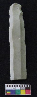 | Description / विवरण | Fragment of stone blade is in off white color, made of fine-grained chert stone, having positive bulb of percussion on one end, other is broken, retouched parallel sides, smooth surface and two mid ridges. |