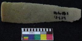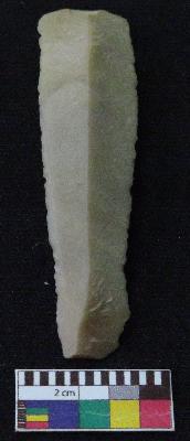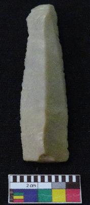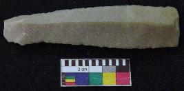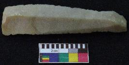 | Description / विवरण | Fragment of stone blade is in off white color, made of fine-grained chert stone, having one end broken, other is curved, retouched sides, smooth surface, mid ridge on top part and triangular section. |
