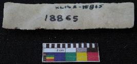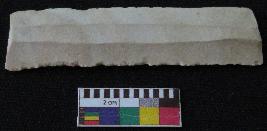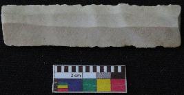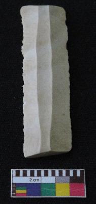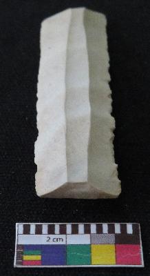 | Description / विवरण | Fragment of stone blade is in white color, made of fine-grained chert stone, having broken ends, retouched parallel sides, smooth surface, double ridge on top part and triangular section. |
