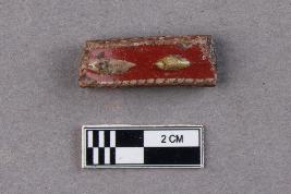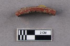 | Description / विवरण | An opaque, smooth glass bangle fragment. The core is black in colour while red colour was applied on top of it later, as is evident from the cross-section. The red was then decorated with pecked borders along both edges in golden colour, and eye-shaped raised dots in yellow at the middle. |