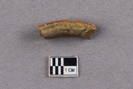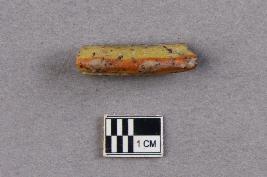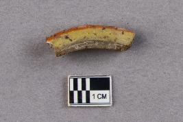 | Description / विवरण | An opaque, smooth glass bangle fragment that is translucent greenish yellow with an orange decorative band dotted with eye-shaped raised dots running along the middle of the exterior surface of the bangle. |