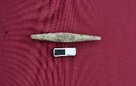| Description / विवरण | A bone point, with flat and thick body. The surface of the object is rough, and both of the ends are pointed. |