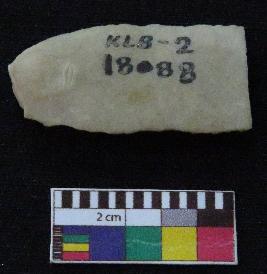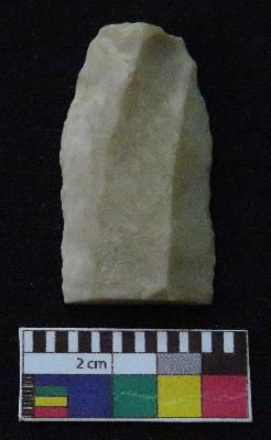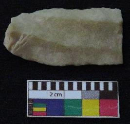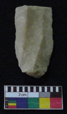 | Description / विवरण | Fragment of stone blade is in off whitish color, made of fine-grained chert stone, having broken one end, other is curved with positive bulb of percussion, retouched sides, smooth surface and double ridge on top part. |