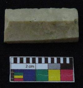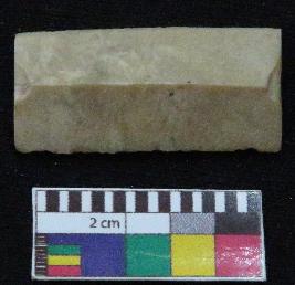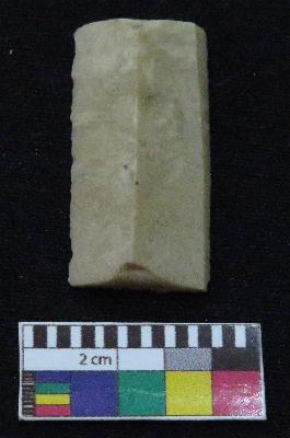 | Description / विवरण | Fragment of stone blade is in off white color, made of fine-grained chert stone, having broken ends, parallel side without retouching, smooth surface, mid ridge and triangular section. |