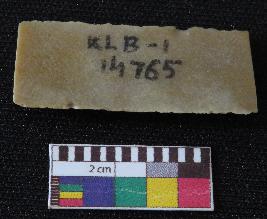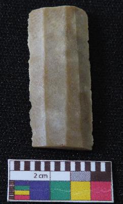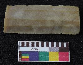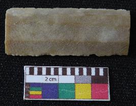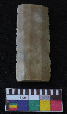 | Description / विवरण | Fragment of stone blade is in brown color, made of fine-grained chert stone, having broken ends, retouched parallel sides, smooth surface and ridge on top portion of blade. |