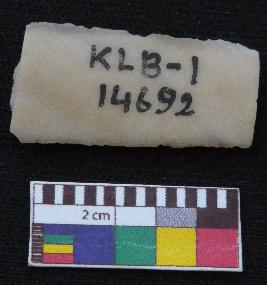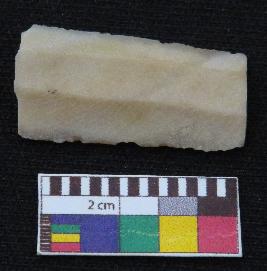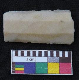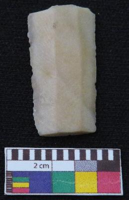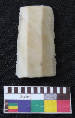 | Description / विवरण | Fragment of stone blade is in off-white color, made of fine-grained chert stone, having broken ends, retouched parallel sides, smooth surface and double ridge on top portion of blade. |