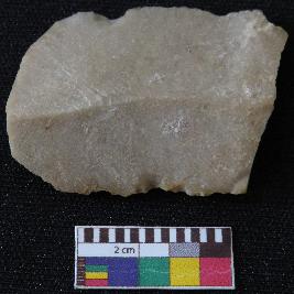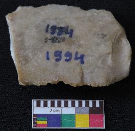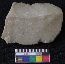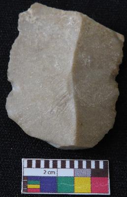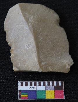 | Description / विवरण | Fragment of stone blade is in light brown color, made of fine-grained chert stone, having broken one end, other is curved, retouched curved sides, smooth surface, mid ridge and triangular section |