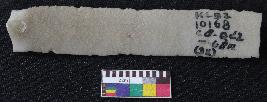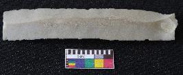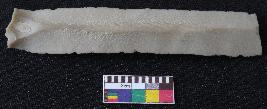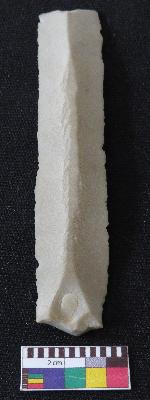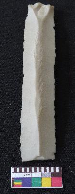 | Description / विवरण | Fragment of stone blade is in off-white color, made of fine-grained chert stone, having broken one end, other has positive bulb of percussion, retouched parallel sides, smooth surface, mid ridge and triangular section. |