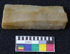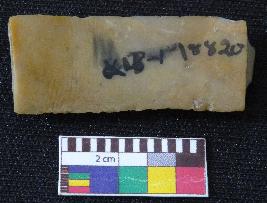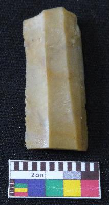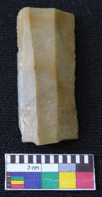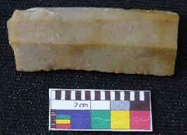 | Description / विवरण | Fragment of stone blade is in dull brown color, made of fine-grained chert stone, having broken ends, retouched parallel side, smooth surface, double ridge and semi-circular section. |