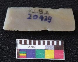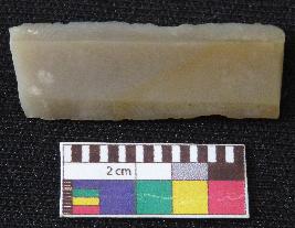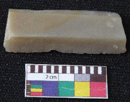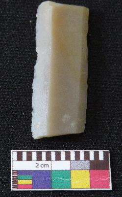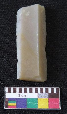 | Description / विवरण | Fragment of stone blade is in light brown color, made of fine-grained chert stone, having broken ends, retouched parallel side, smooth surface and double ridge. |