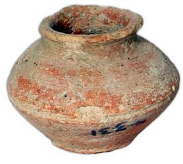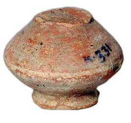 | Description / विवरण | Miniature red ware pot with carinated waist and flat bottom, concave neck with splayed out thickened rim. |