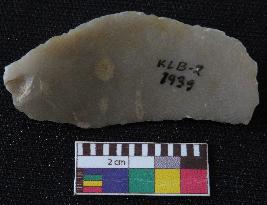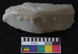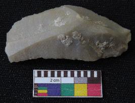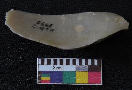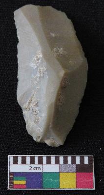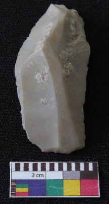 | Description / विवरण | Complete stone blade is in off-white color, made of fine-grained chert stone, having positive bulb of percussion at one end, other is curved, retouched side, smooth surface, lower surface is concave, mid ridge on upper part and triangular section. |