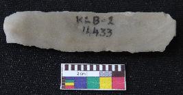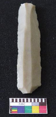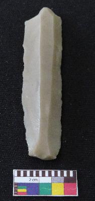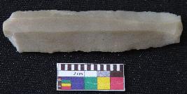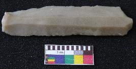 | Description / विवरण | Fragment of stone blade is in off-white color, made of fine-grained chert stone, having one end broken, other end has positive bulb of percussion, retouched parallel sides, smooth surface and double ridge. |