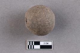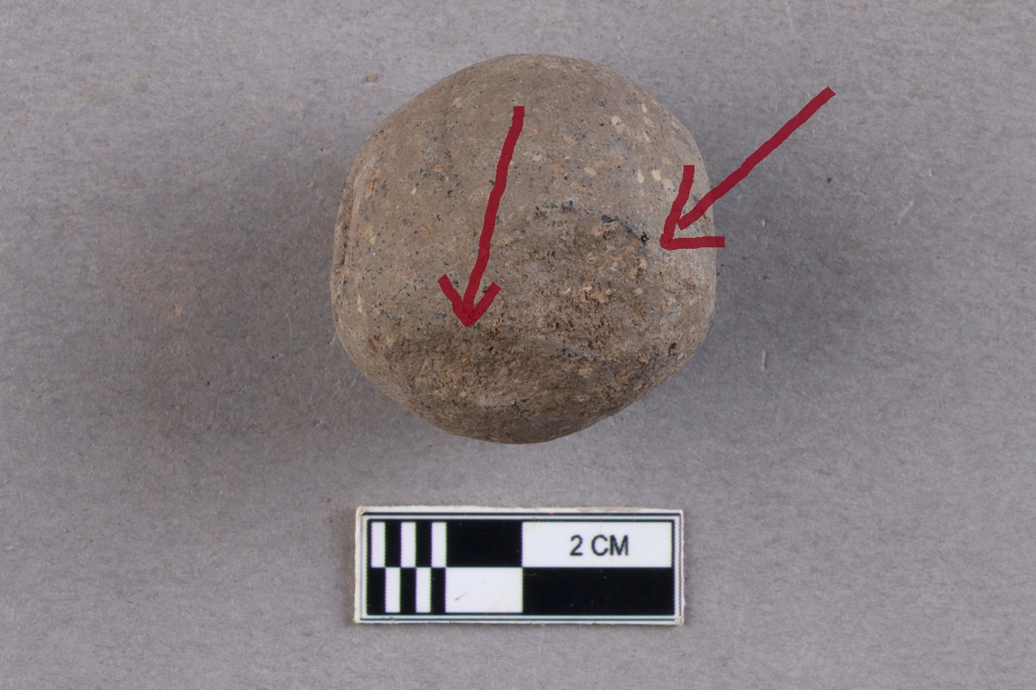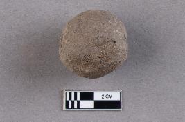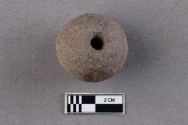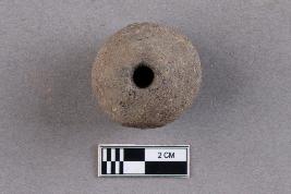 A large, rounded bicone bead of terracotta with a central perforation. It is grey in colour.