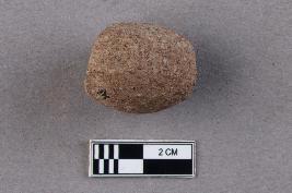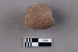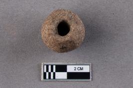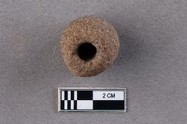 | Description / विवरण | An irregularly barrel-shaped terracotta bead with a central perforation. It is reddish in colour. |