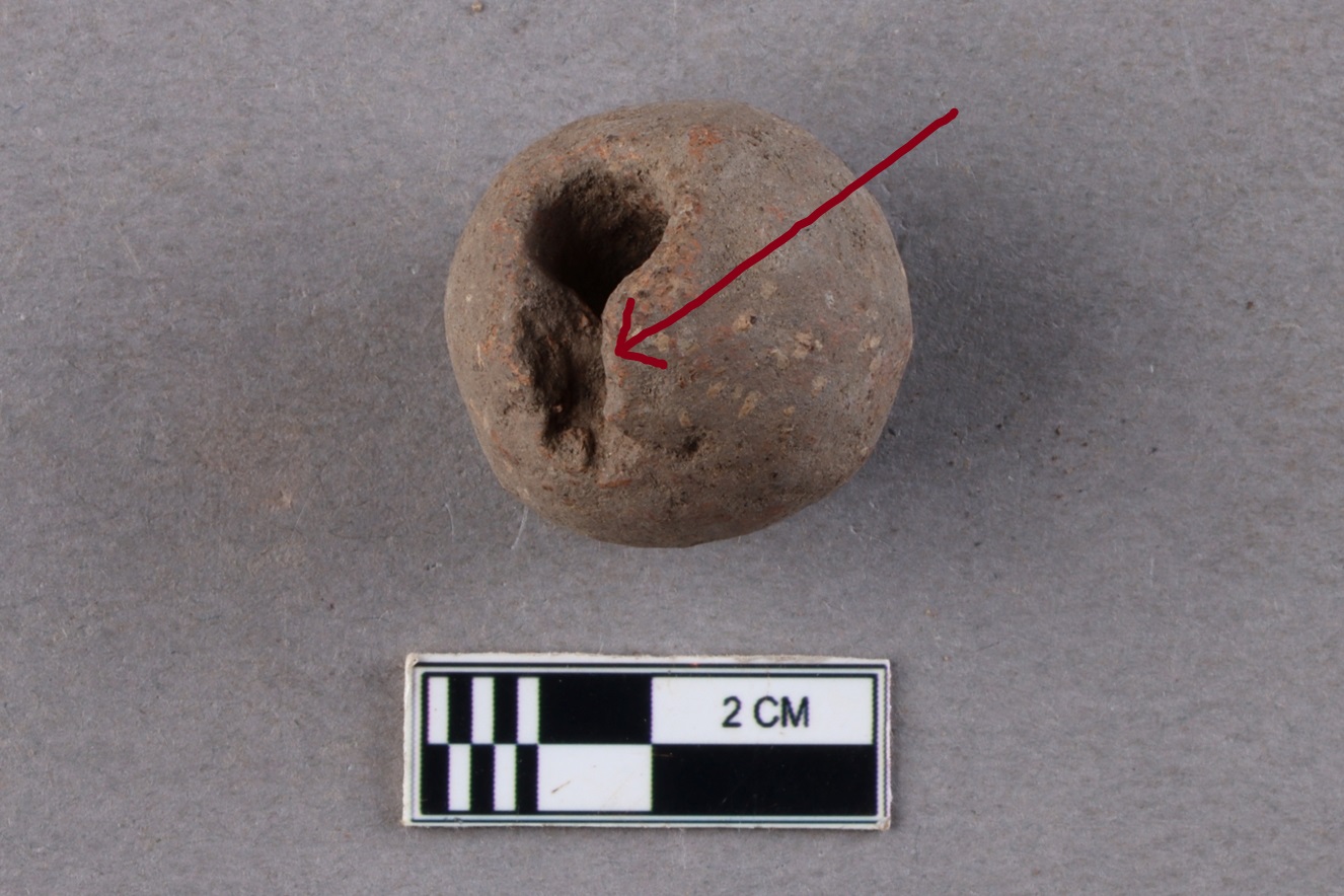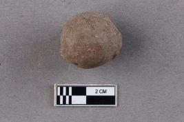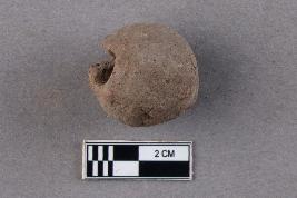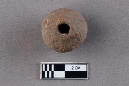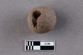 A rounded, large terracotta bead with central perforation. It appears to be reddish in colour.