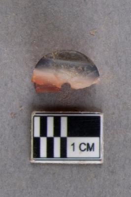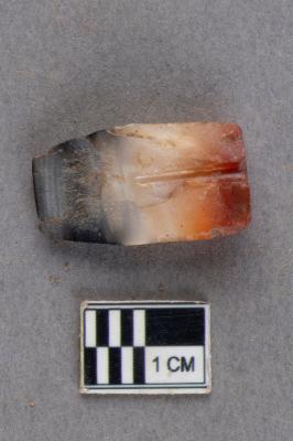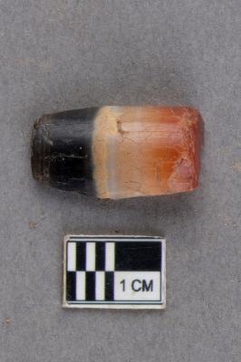 | Description / विवरण | The vertically split half of a half-drilled, barrel-shaped carnelian bead. The drilling pattern is cylindrical as observed from the cross-section and it was top-drilled. The material is carnelian with a gradient of colours transitioning from red-orange-white to black with a golden strip. |