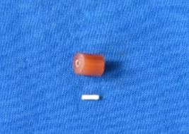 | Description / विवरण | A cylindrical shaped bead of carnelian in red colour with a perforation at the center and a smooth surface. |