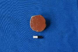 | Description / विवरण | A circular shaped terracotta hopscotch made out of a potsherd of red slipped ware with unfinished edges. |