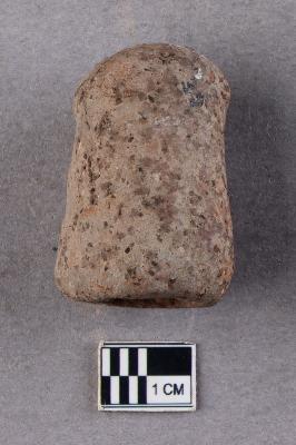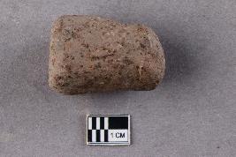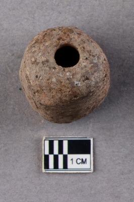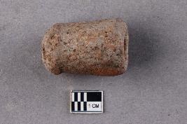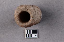 | Description / विवरण | An irregularly, slightly rounded, cylindrical terracotta object with a longitudinal perforation through the central axis. One perforation is smaller than the other. |