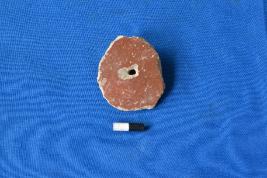 | Description / विवरण | A terracotta spindle whorl or wheel made out of a potsherd of red slipped ware with unfinished edges and a hole in the center. |