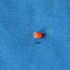 | Description / विवरण | A short cylindrical shaped bead of carnelian in red colour with perforation at the center and a smooth surface. |