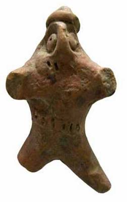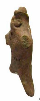 | Description / विवरण | It is a rare figure recovered from the excavation. Hands and legs are broken and missing. The head is shown with wide open mouth exposing pointed teeth. Nose extended upwards from its place to the head, just like semi-circular or arch fashion. Big sockets filled with bulged round eye balls. The head is topped by hat having flat base and domical top. It simply looks a monster having human body and head with reptile features. It appears that the body is covered with an upper garment extended upto knee-level. At the waist, there is a waist-belt decorated with vertical strokes. |