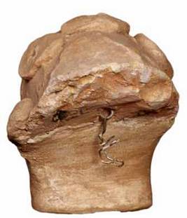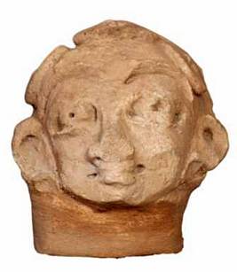 | Description / विवरण | Broken head of human figure with round face, hair tied in a head band, which has round jewels on either side, broad nose chipped off at the tip. It wears patra kundalas. Almond shaped eyes with round eye balls and pinched pupils, thick eye brows. |