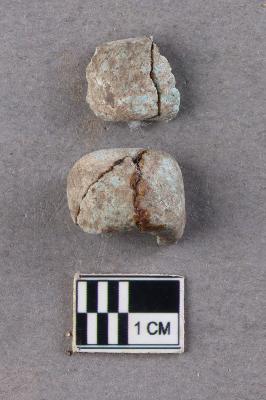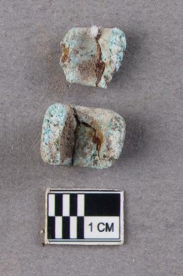 | Description / विवरण | A short barrel-shaped bead with top drilling. The perforation is cylindrical within. It is bluish in colour and broken into two pieces. |