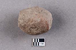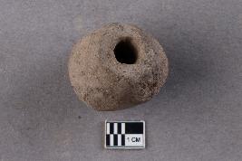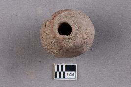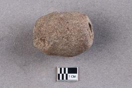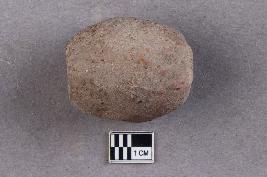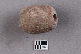 | Description / विवरण | An irregular bicone bead of terracotta. It is centrally perforated and reddish in colour. |